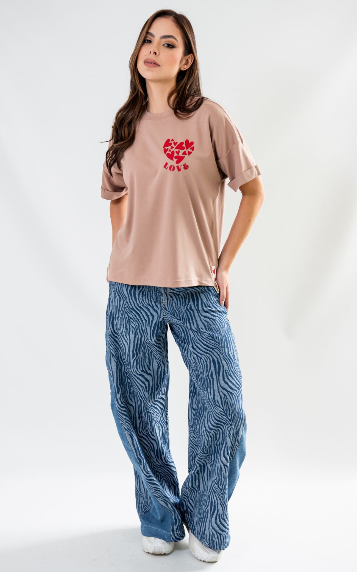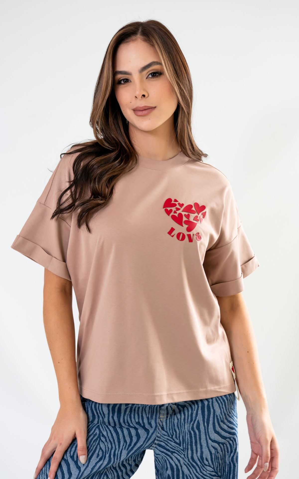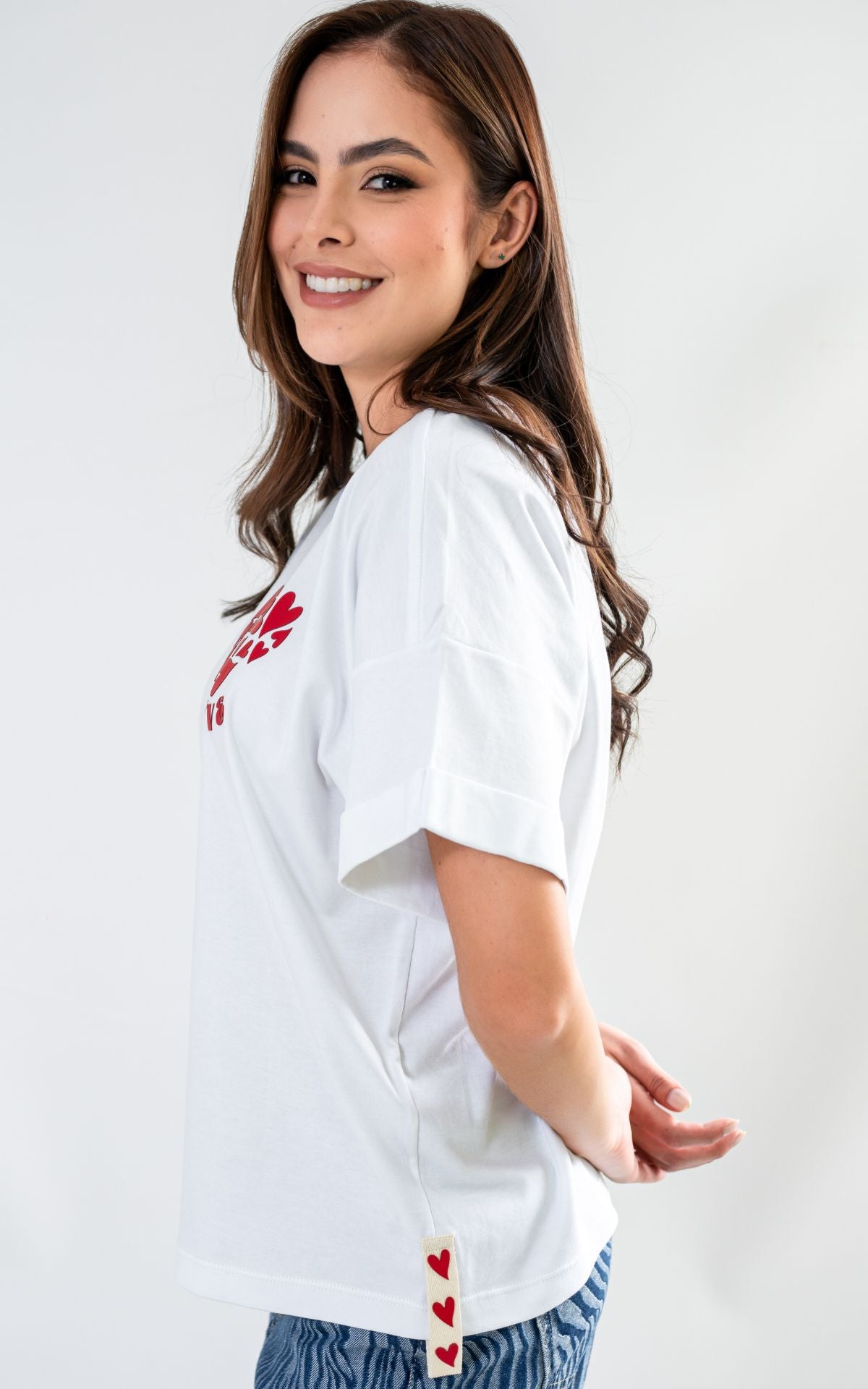 Camiseta de silueta oversize confeccionada en 100% algodón, diseñada para ofrecer frescura y versatilidad. Presenta un estampado frontal de corazón con la palabra "LOVE" en contraste, mangas con dobladillo estructurado y una delicada hiladilla de corazones en el costado inferior. Una prenda esencial con detalles de diseño únicos.