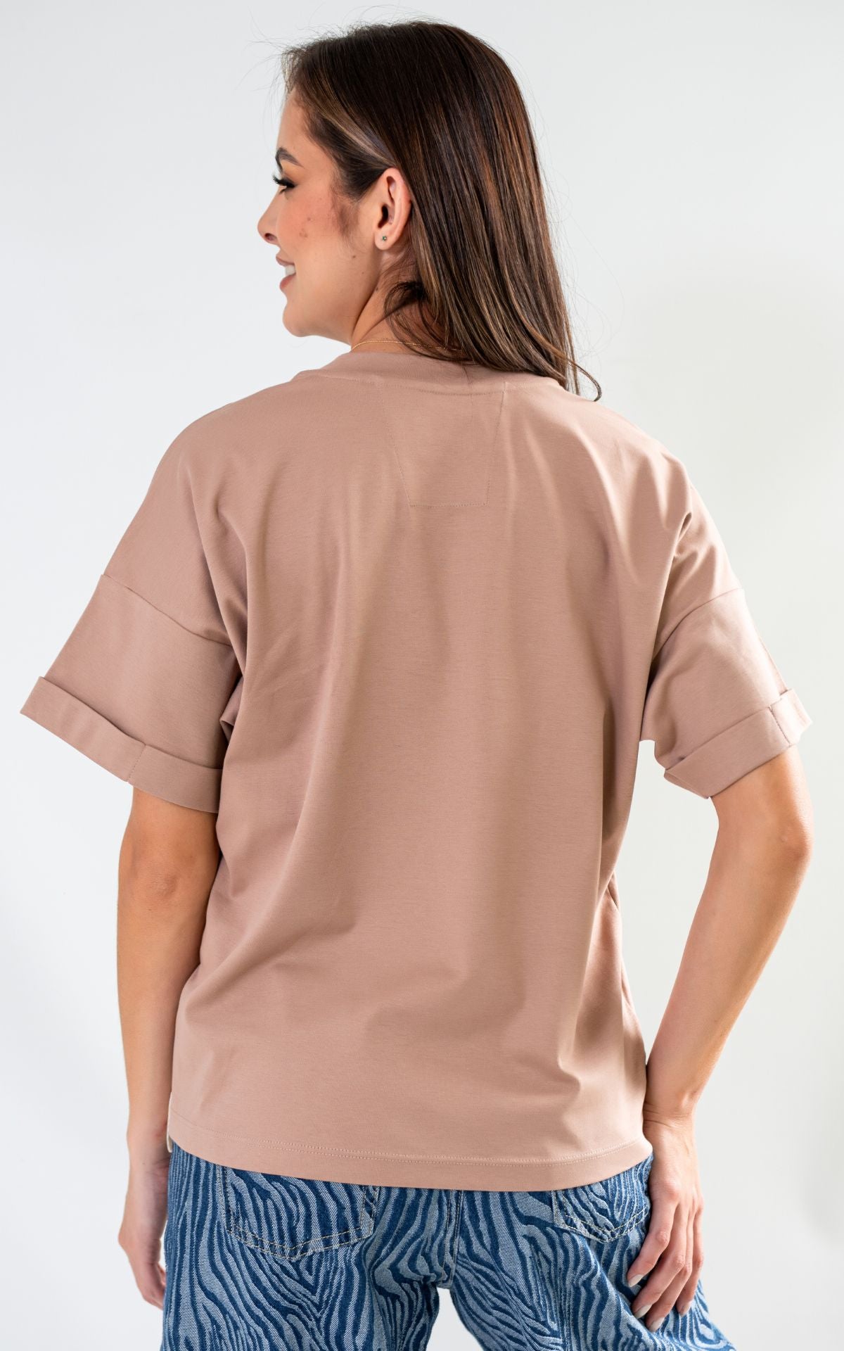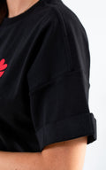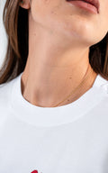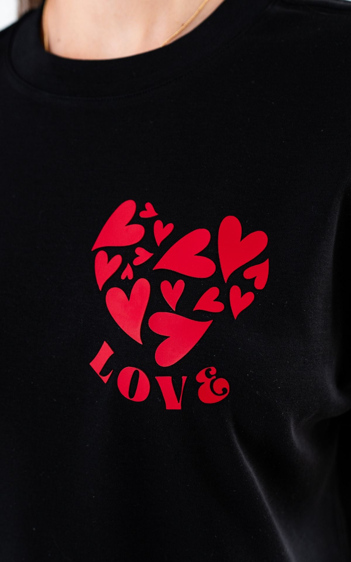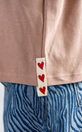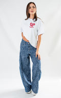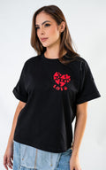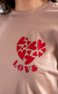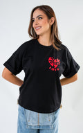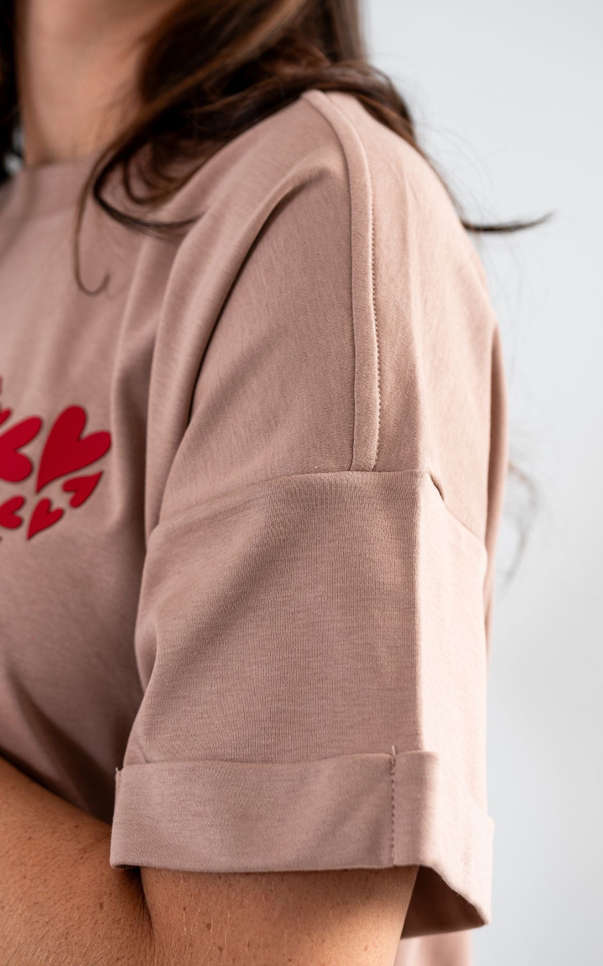 Camiseta de silueta oversize confeccionada en 100% algodón, diseñada para ofrecer frescura y versatilidad. Presenta un estampado frontal de corazón con la palabra "LOVE" en contraste, mangas con dobladillo estructurado y una delicada hiladilla de corazones en el costado inferior. Una prenda esencial con detalles de diseño únicos.