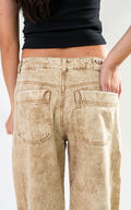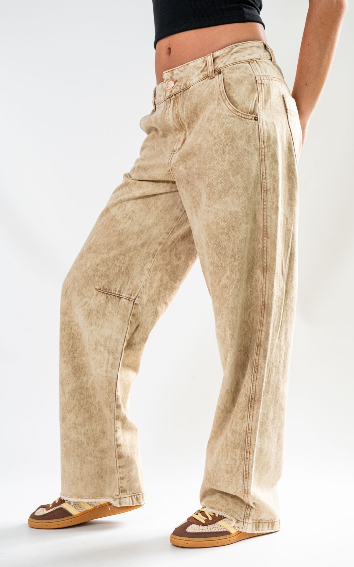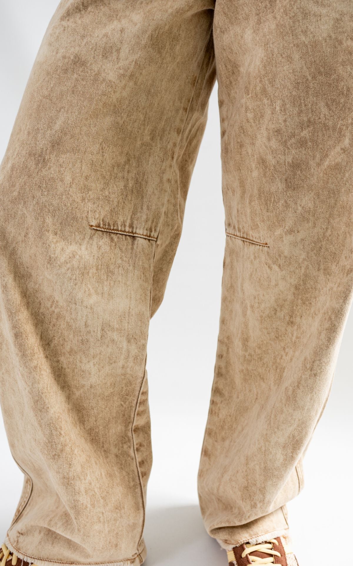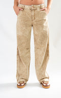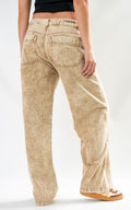 Jean de silueta bota recta confeccionado en denim premium de alto gramaje, procesado con un lavado especializado en tono arena de efecto marmoleado. Su diseño se distingue por cortes estructurales en la zona de las rodillas y un juego de costuras asimétricas que aportan volumen y una horma moderna. Incluye bolsillos posteriores de diseño minimalista y cierre frontal con botón contramarcado. Una pieza única con el sello de calidad.