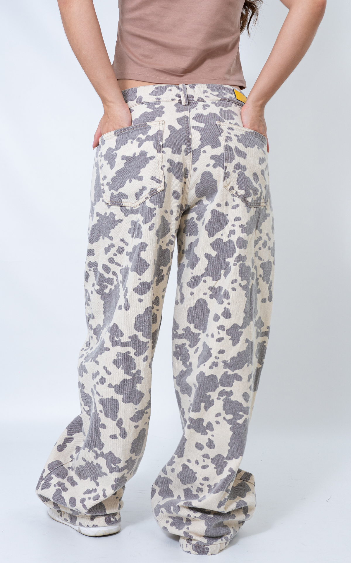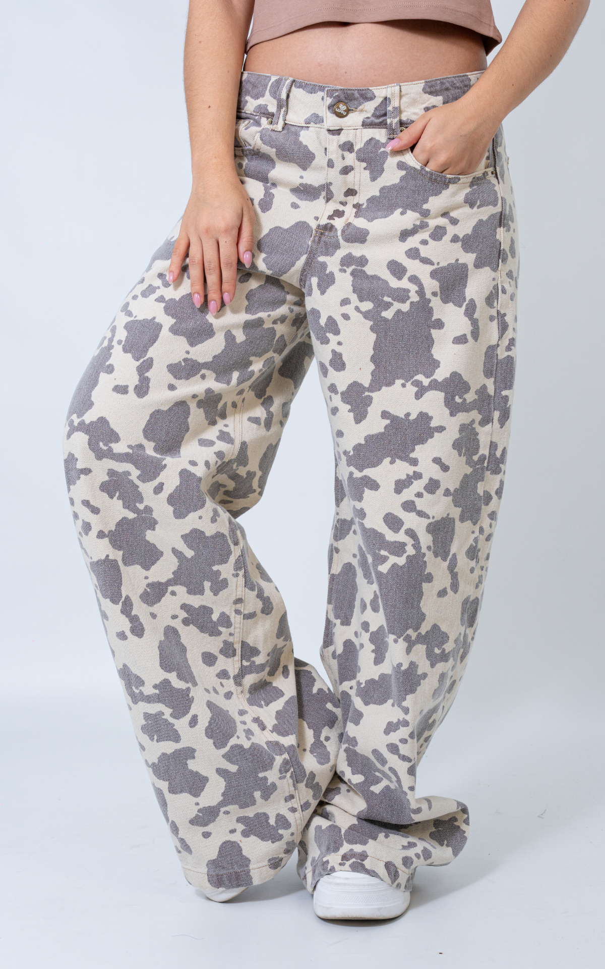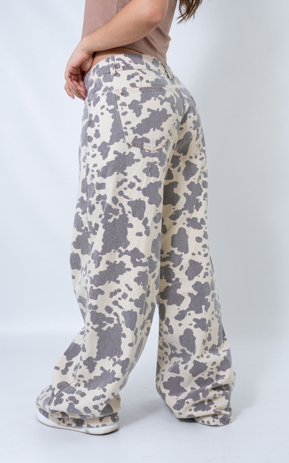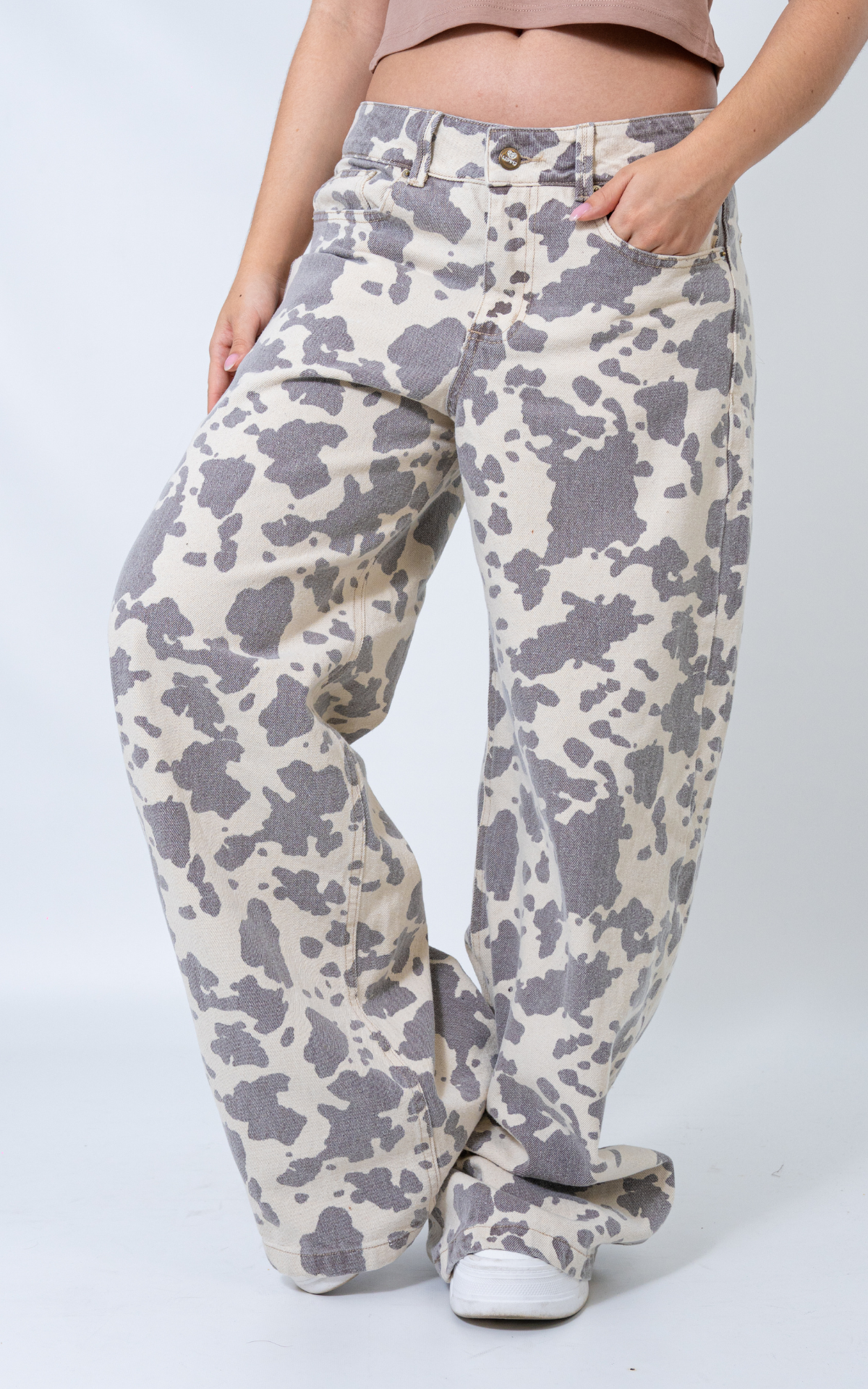 Confeccionado en una tela índigo rígida, estampado de vaca , en un tono vainilla que lo hace único y atrevido.