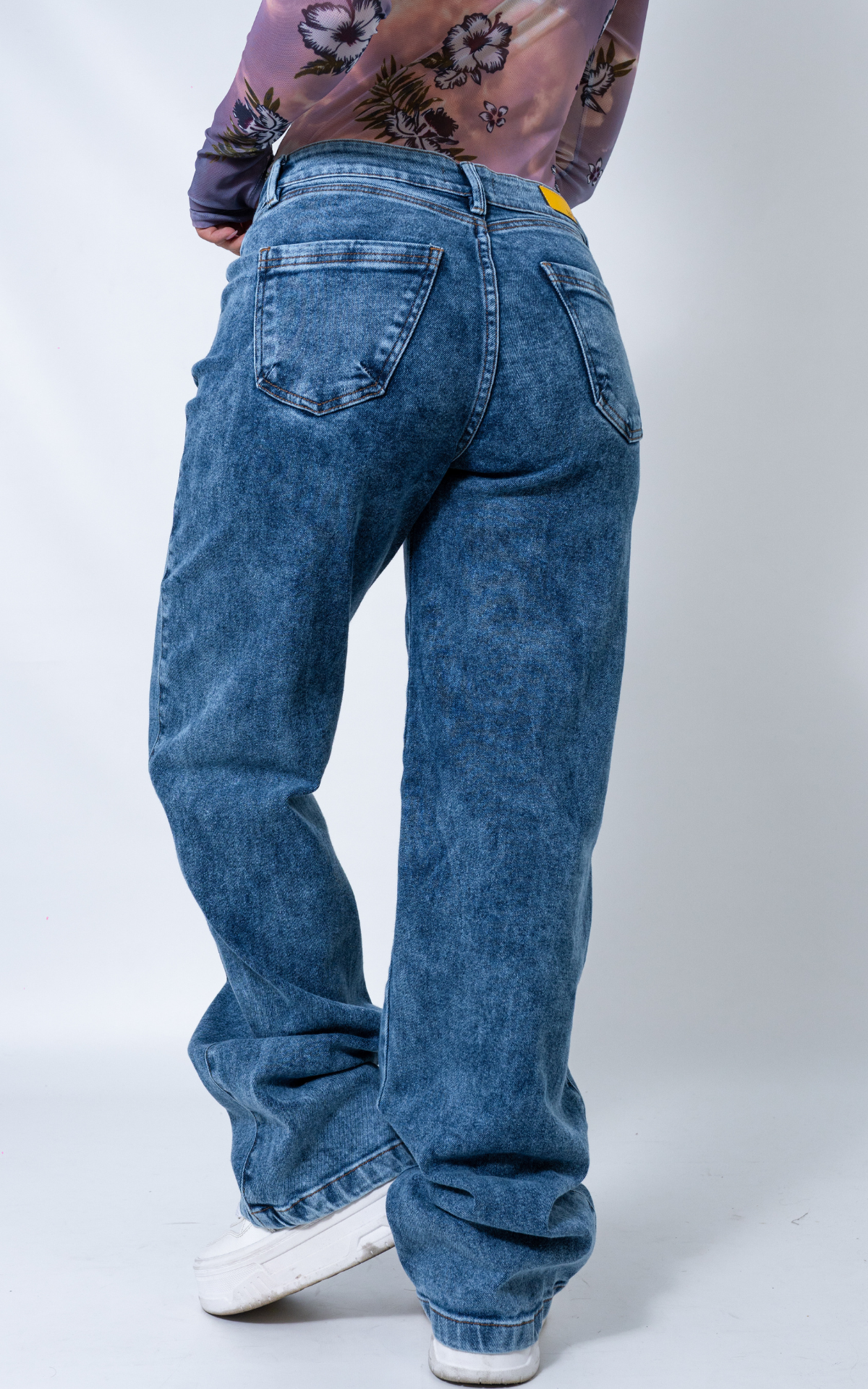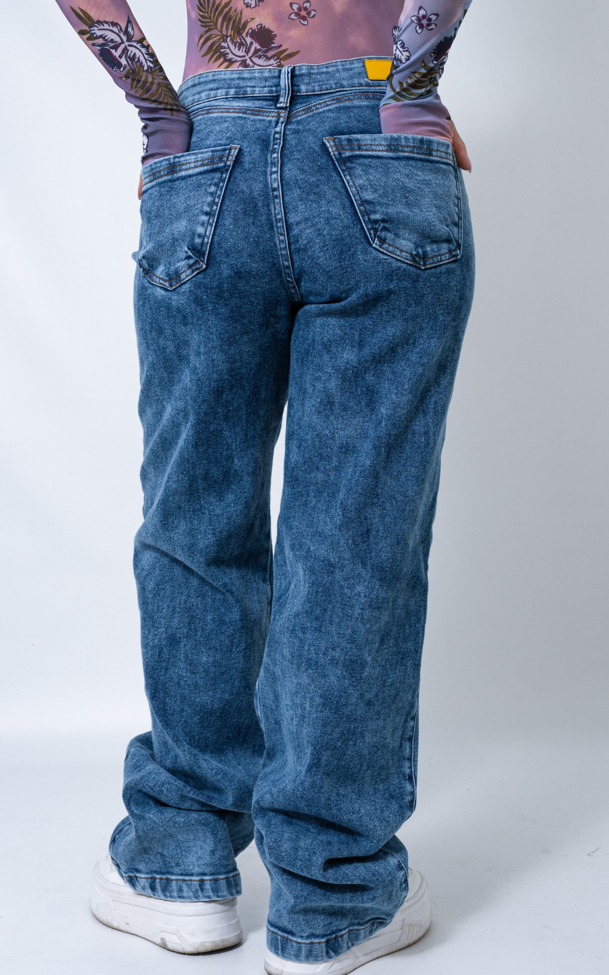 De bota recta y un proceso de lavandería saraviado en azul que lo hace único, cómodo y versátil para cualquier ocasión.
