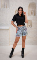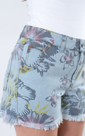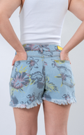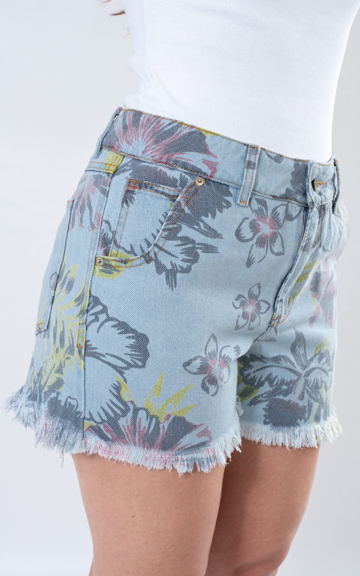 Confeccionado en denim rígido, estampado con flores en tonos vibrantes que le dan un aire tropical único. Su diseño incluye cuatro bolsillos funcionales y un ruedo desflecado que aporta ese toque relajado y moderno que tanto amamos.